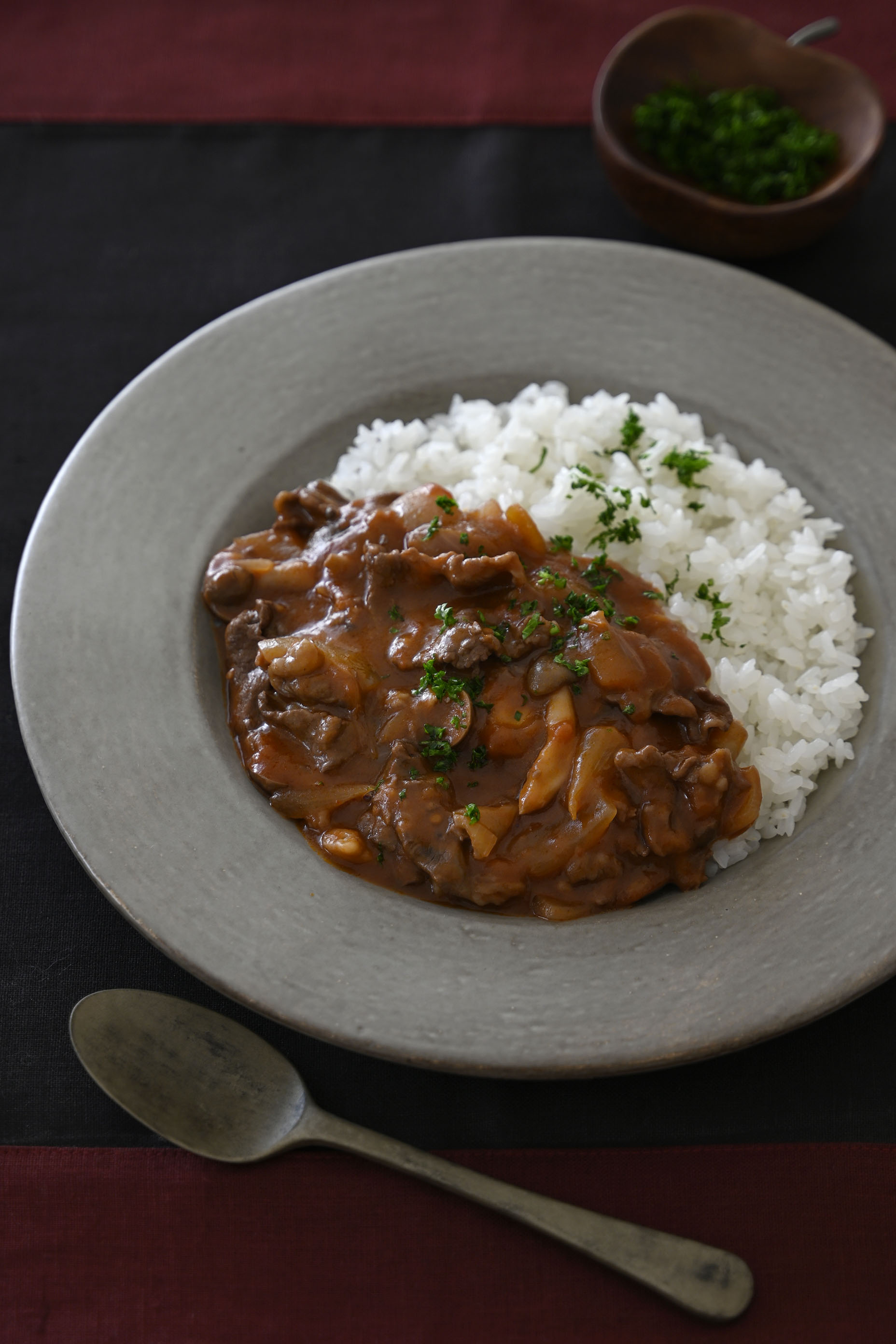 クツクツと温め直して、ご飯にたっぷりかけます。シンプルに美味しく、パセリを散らしてさっぱりと、そして生クリームの風味を加えてまろやかに。