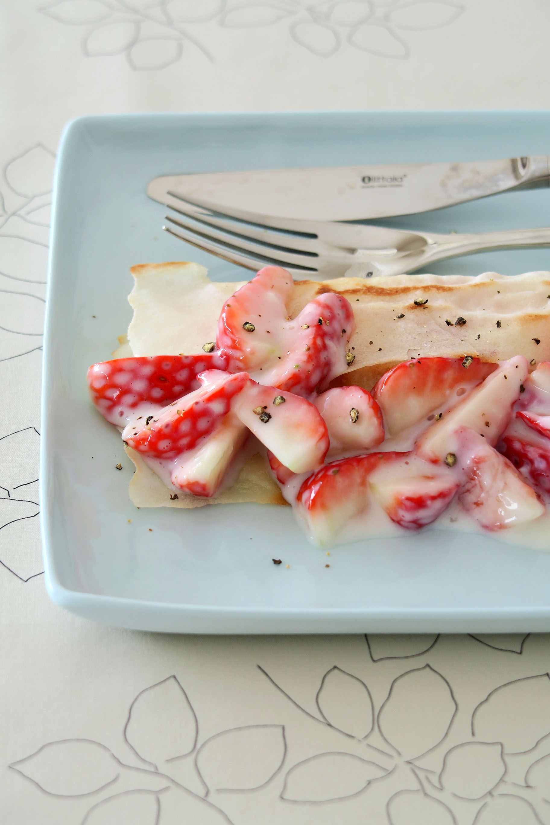 こちらのいちごのデザートは、ごくごく簡単なもの。ロティを模してつくった生地に、いちごを添えてお手製ミルククリームをかけたもの。