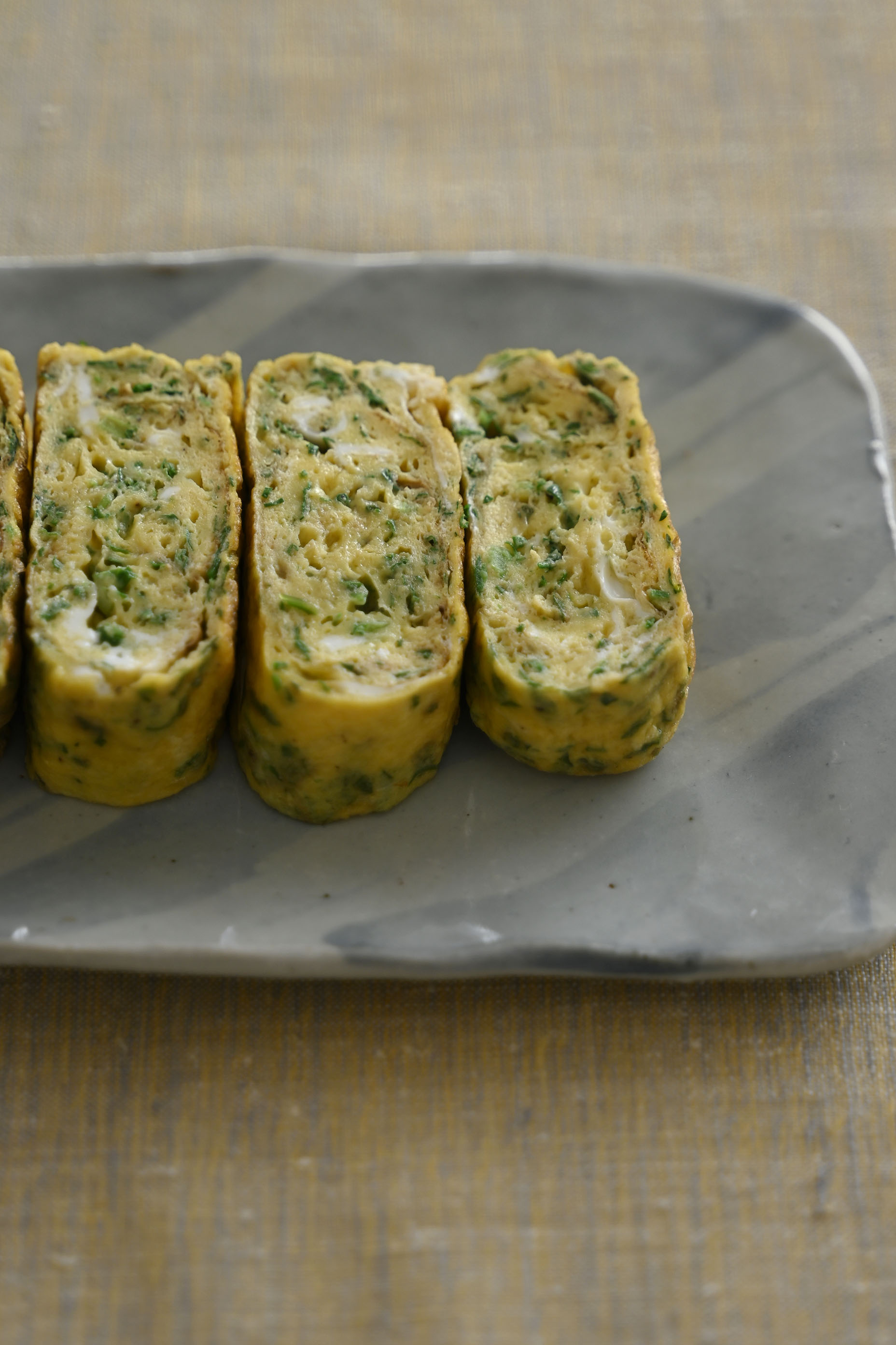 甘い卵焼きや、だしを利かせた卵焼きとは、また違った風合い。オムレツに近い味わいですが、和食の献立に組み入れたので卵焼きにしました。
